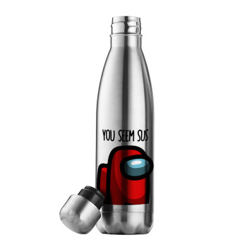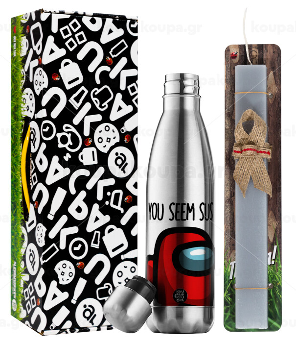 Among US, you seem sus, Πασχαλινή Λαμπάδα με μεταλλικό παγούρι θερμός ανοξείδωτο (500ml) & κερί αρωματικό πλακέ (30cm) (ΓΚΡΙ)