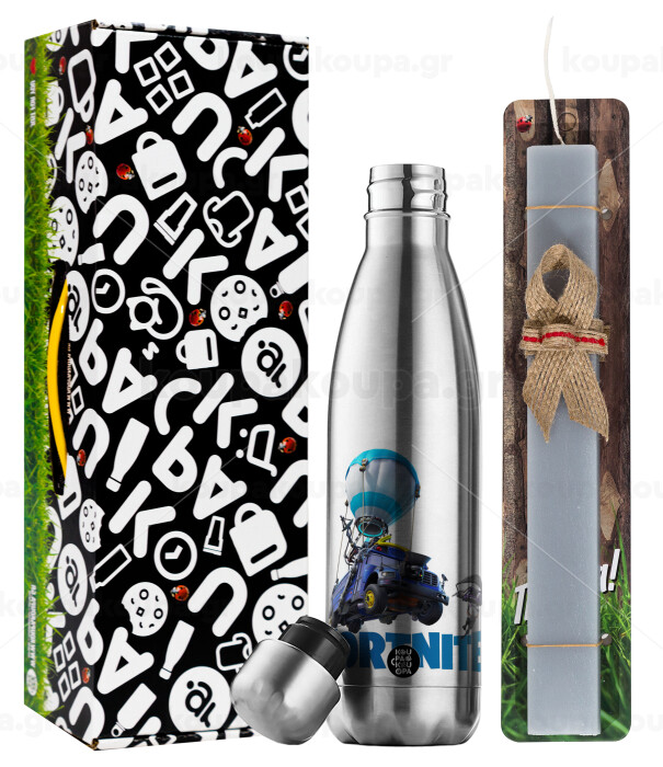 Fortnite Bus, Πασχαλινή Λαμπάδα με μεταλλικό παγούρι θερμός ανοξείδωτο (500ml) & κερί αρωματικό πλακέ (30cm) (ΓΚΡΙ)