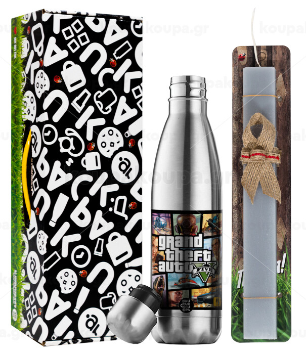 GTA V, Πασχαλινή Λαμπάδα με μεταλλικό παγούρι θερμός ανοξείδωτο (500ml) & κερί αρωματικό πλακέ (30cm) (ΓΚΡΙ)