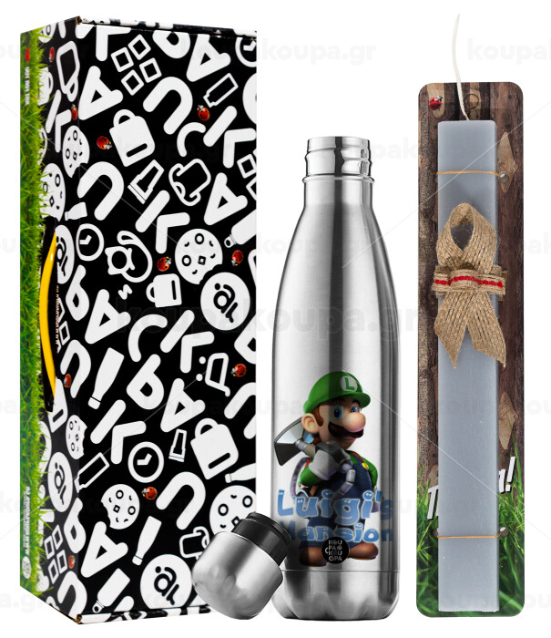 Luigi's Mansion, Πασχαλινή Λαμπάδα με μεταλλικό παγούρι θερμός ανοξείδωτο (500ml) & κερί αρωματικό πλακέ (30cm) (ΓΚΡΙ)