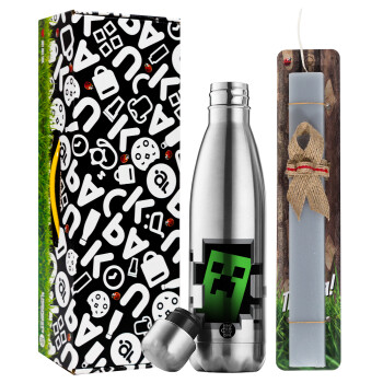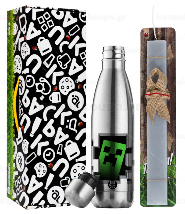 Minecraft creeper, Πασχαλινή Λαμπάδα με μεταλλικό παγούρι θερμός ανοξείδωτο (500ml) & κερί αρωματικό πλακέ (30cm) (ΓΚΡΙ)