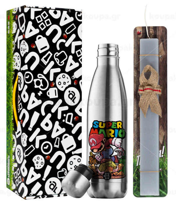 Super mario Jump, Πασχαλινή Λαμπάδα με μεταλλικό παγούρι θερμός ανοξείδωτο (500ml) & κερί αρωματικό πλακέ (30cm) (ΓΚΡΙ)