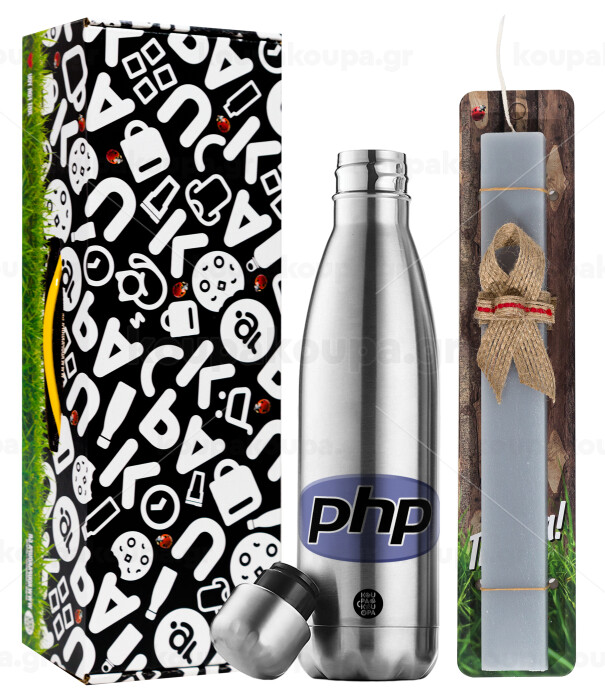 PHP, Πασχαλινή Λαμπάδα με μεταλλικό παγούρι θερμός ανοξείδωτο (500ml) & κερί αρωματικό πλακέ (30cm) (ΓΚΡΙ)