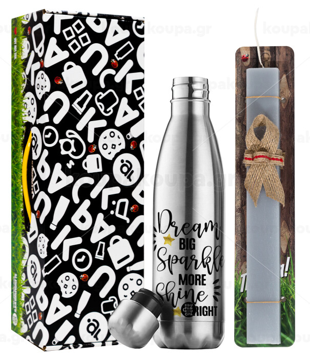 Dream big, Sparkle more, Shine bright, Πασχαλινή Λαμπάδα με μεταλλικό παγούρι θερμός ανοξείδωτο (500ml) & κερί αρωματικό πλακέ (30cm) (ΓΚΡΙ)