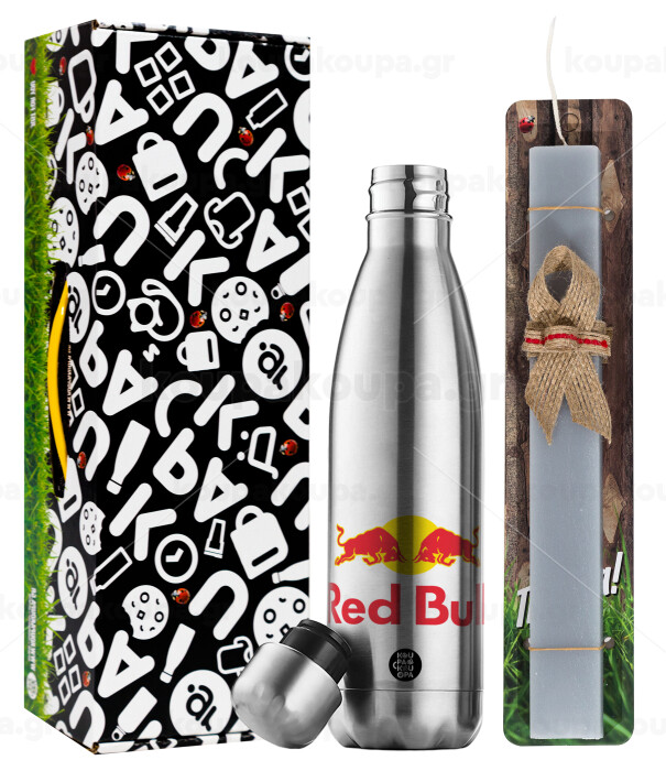 Redbull, Πασχαλινή Λαμπάδα με μεταλλικό παγούρι θερμός ανοξείδωτο (500ml) & κερί αρωματικό πλακέ (30cm) (ΓΚΡΙ)
