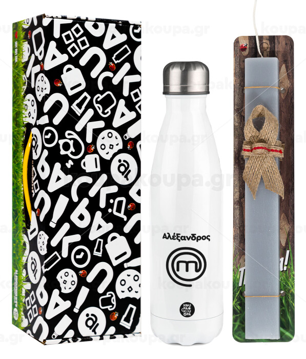 Master Chef Greece, Πασχαλινή Λαμπάδα με μεταλλικό παγούρι θερμός λευκός (500ml) & λαμπάδα αρωματική πλακέ (30cm) (ΓΚΡΙ)