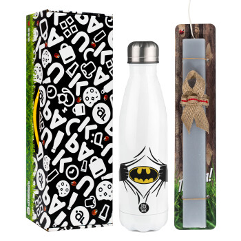 Hero batman, Πασχαλινή Λαμπάδα με μεταλλικό παγούρι θερμός λευκός (500ml) & λαμπάδα αρωματική πλακέ (30cm) (ΓΚΡΙ)