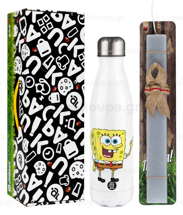 Μπομπ Σφουγγαράκης character, Πασχαλινή Λαμπάδα με μεταλλικό παγούρι θερμός λευκός (500ml) & λαμπάδα αρωματική πλακέ (30cm) (ΓΚΡΙ)