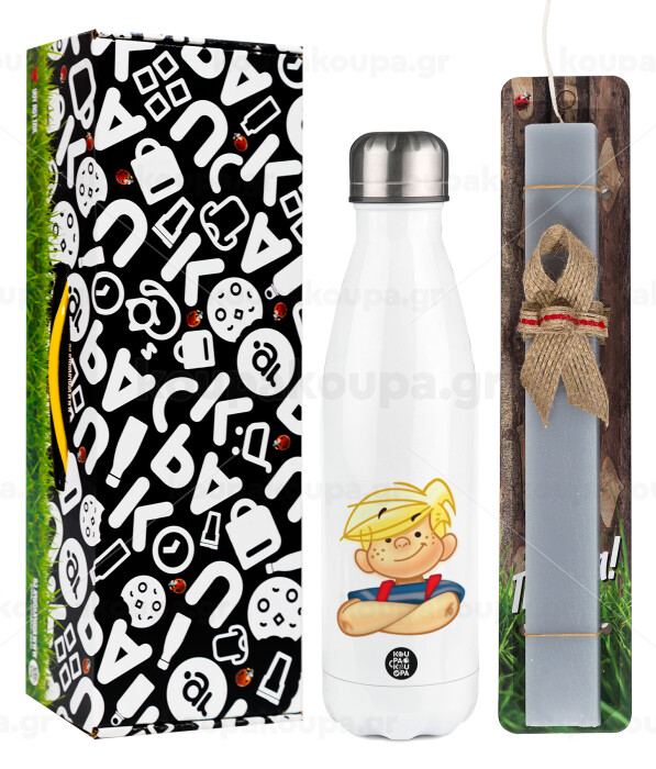 Ντένις ο τρομερός, Πασχαλινή Λαμπάδα με μεταλλικό παγούρι θερμός λευκός (500ml) & λαμπάδα αρωματική πλακέ (30cm) (ΓΚΡΙ)