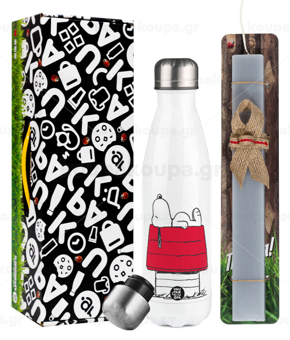 Το σπίτι του snoopy, Πασχαλινή Λαμπάδα με μεταλλικό παγούρι θερμός λευκός (500ml) & λαμπάδα αρωματική πλακέ (30cm) (ΓΚΡΙ)