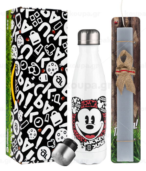 Mickey Mouse, Πασχαλινή Λαμπάδα με μεταλλικό παγούρι θερμός λευκός (500ml) & λαμπάδα αρωματική πλακέ (30cm) (ΓΚΡΙ)