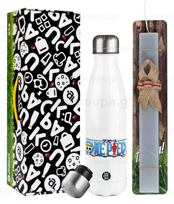 Onepiece logo, Πασχαλινή Λαμπάδα με μεταλλικό παγούρι θερμός λευκός (500ml) & λαμπάδα αρωματική πλακέ (30cm) (ΓΚΡΙ)