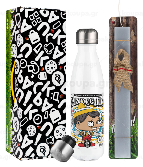 Pinocchio, Πασχαλινή Λαμπάδα με μεταλλικό παγούρι θερμός λευκός (500ml) & λαμπάδα αρωματική πλακέ (30cm) (ΓΚΡΙ)