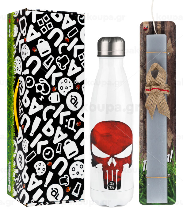 Red skull, Πασχαλινή Λαμπάδα με μεταλλικό παγούρι θερμός λευκός (500ml) & λαμπάδα αρωματική πλακέ (30cm) (ΓΚΡΙ)