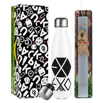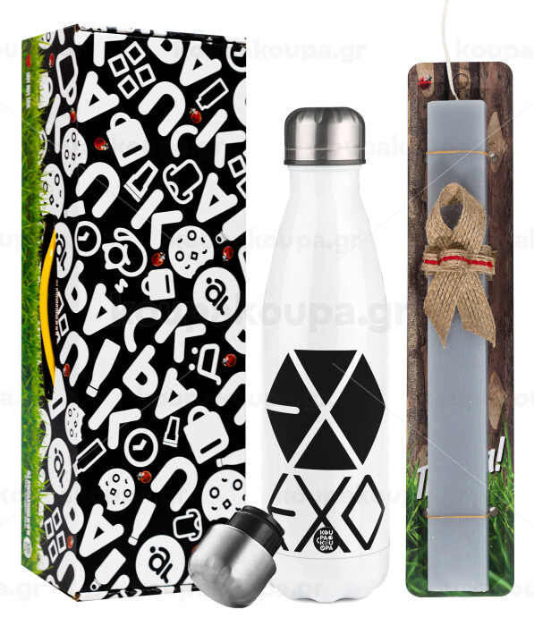 EXO Band korea, Πασχαλινή Λαμπάδα με μεταλλικό παγούρι θερμός λευκός (500ml) & λαμπάδα αρωματική πλακέ (30cm) (ΓΚΡΙ)