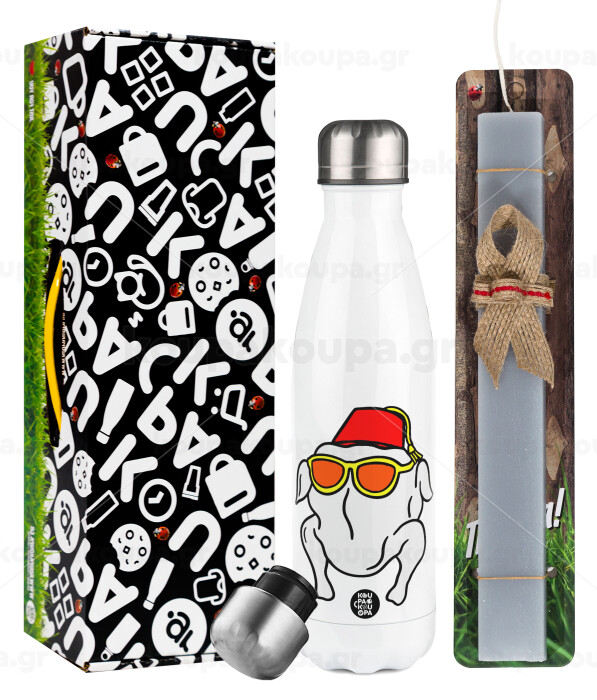Friends turkey, Πασχαλινή Λαμπάδα με μεταλλικό παγούρι θερμός λευκός (500ml) & λαμπάδα αρωματική πλακέ (30cm) (ΓΚΡΙ)
