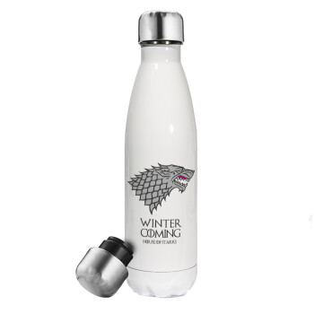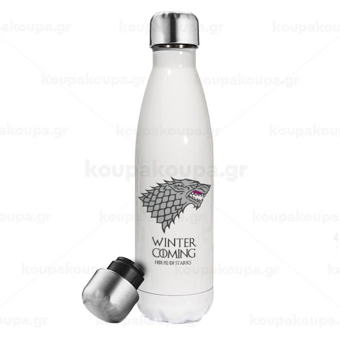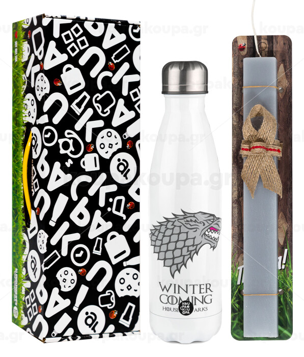 GOT House of Starks, winter coming, Πασχαλινή Λαμπάδα με μεταλλικό παγούρι θερμός λευκός (500ml) & λαμπάδα αρωματική πλακέ (30cm) (ΓΚΡΙ)