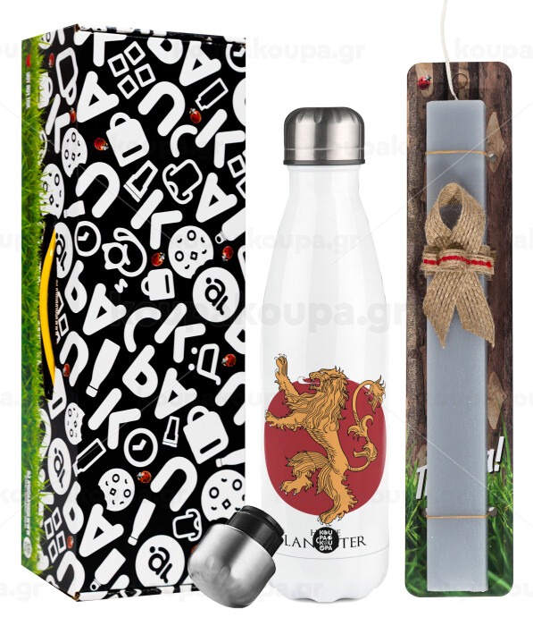 House Lannister GOT, Πασχαλινή Λαμπάδα με μεταλλικό παγούρι θερμός λευκός (500ml) & λαμπάδα αρωματική πλακέ (30cm) (ΓΚΡΙ)