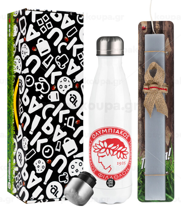 Ολυμπιακός, Πασχαλινή Λαμπάδα με μεταλλικό παγούρι θερμός λευκός (500ml) & λαμπάδα αρωματική πλακέ (30cm) (ΓΚΡΙ)