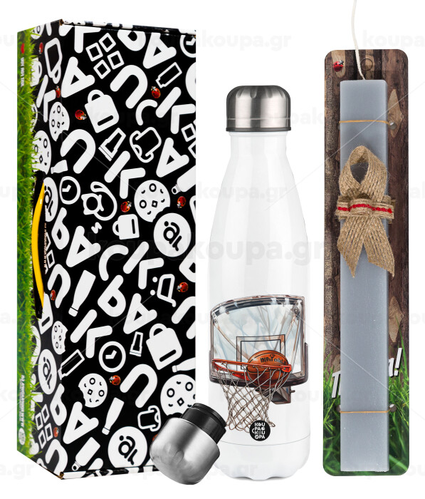 Basketball, Πασχαλινή Λαμπάδα με μεταλλικό παγούρι θερμός λευκός (500ml) & λαμπάδα αρωματική πλακέ (30cm) (ΓΚΡΙ)