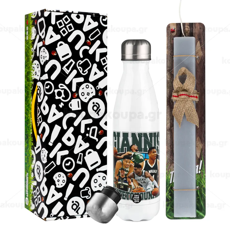 Giannis Antetokounmpo, Πασχαλινή Λαμπάδα με μεταλλικό παγούρι θερμός λευκός (500ml) & λαμπάδα αρωματική πλακέ (30cm) (ΓΚΡΙ)