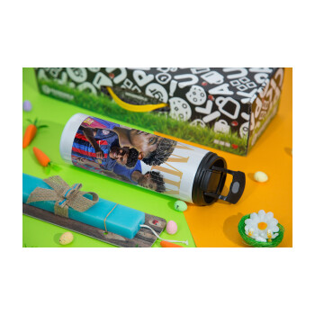 lamine yamal FCB, Πασχαλινή Λαμπάδα με μεταλλικό παγούρι θερμός λευκός (500ml) & λαμπάδα αρωματική πλακέ (30cm) (ΓΚΡΙ)