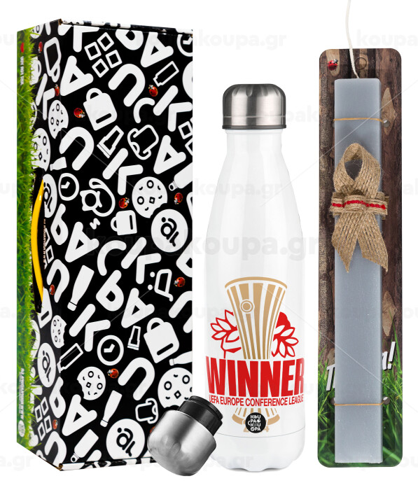 Europa Conference League WINNER, Πασχαλινή Λαμπάδα με μεταλλικό παγούρι θερμός λευκός (500ml) & λαμπάδα αρωματική πλακέ (30cm) (ΓΚΡΙ)