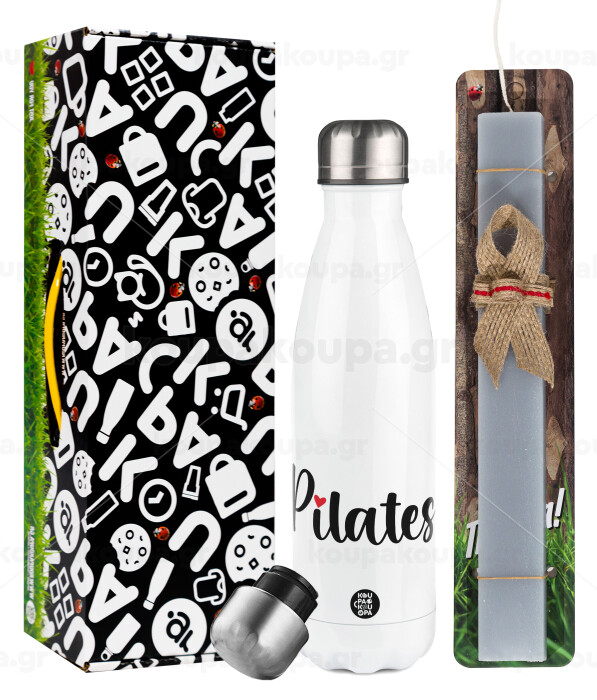Pilates love, Πασχαλινή Λαμπάδα με μεταλλικό παγούρι θερμός λευκός (500ml) & λαμπάδα αρωματική πλακέ (30cm) (ΓΚΡΙ)