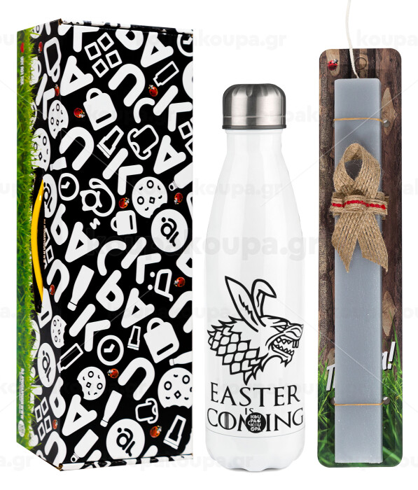 Easter is coming (GOT), Πασχαλινή Λαμπάδα με μεταλλικό παγούρι θερμός λευκός (500ml) & λαμπάδα αρωματική πλακέ (30cm) (ΓΚΡΙ)