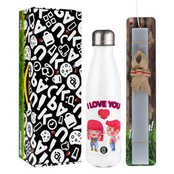 Couple, I love you, Πασχαλινή Λαμπάδα με μεταλλικό παγούρι θερμός λευκός (500ml) & λαμπάδα αρωματική πλακέ (30cm) (ΓΚΡΙ)