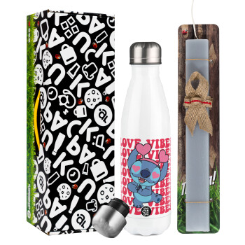 Lilo & Stitch Love vibes, Πασχαλινή Λαμπάδα με μεταλλικό παγούρι θερμός λευκός (500ml) & λαμπάδα αρωματική πλακέ (30cm) (ΓΚΡΙ)