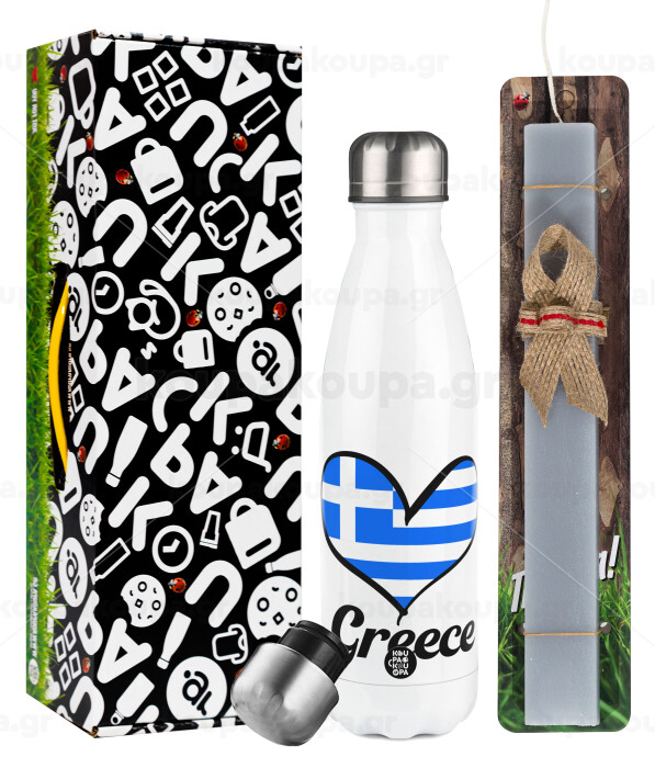 Greece flag, Πασχαλινή Λαμπάδα με μεταλλικό παγούρι θερμός λευκός (500ml) & λαμπάδα αρωματική πλακέ (30cm) (ΓΚΡΙ)