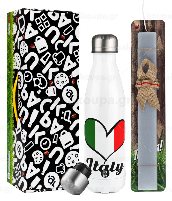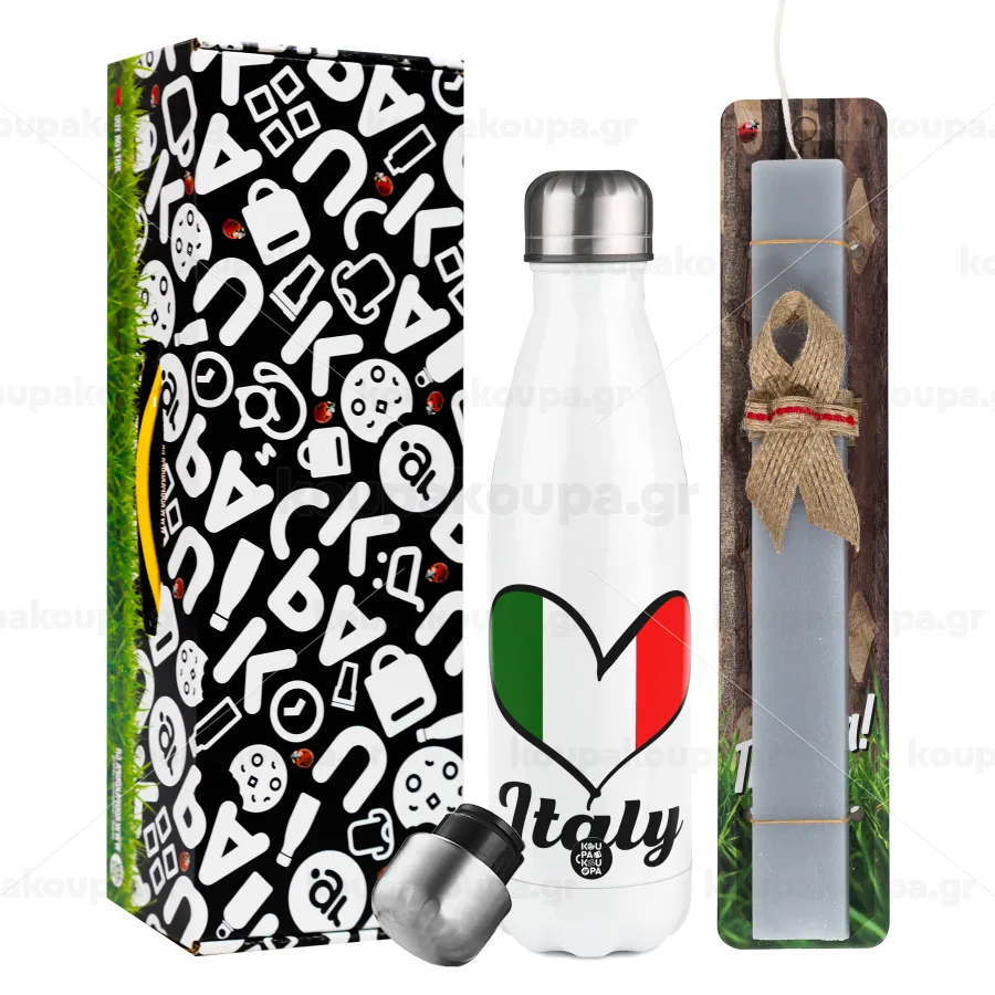 Italy flag, Πασχαλινή Λαμπάδα με μεταλλικό παγούρι θερμός λευκός (500ml) & λαμπάδα αρωματική πλακέ (30cm) (ΓΚΡΙ)
