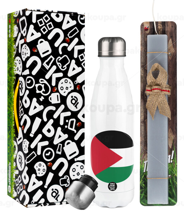 Σημαία Παλαιστίνης, Πασχαλινή Λαμπάδα με μεταλλικό παγούρι θερμός λευκός (500ml) & λαμπάδα αρωματική πλακέ (30cm) (ΓΚΡΙ)