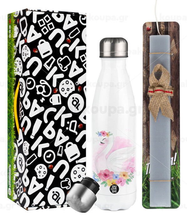 Λευκός κύκνος, Πασχαλινή Λαμπάδα με μεταλλικό παγούρι θερμός λευκός (500ml) & λαμπάδα αρωματική πλακέ (30cm) (ΓΚΡΙ)