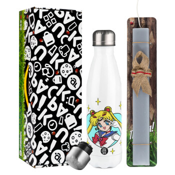 Sailor Moon star, Πασχαλινή Λαμπάδα με μεταλλικό παγούρι θερμός λευκός (500ml) & λαμπάδα αρωματική πλακέ (30cm) (ΓΚΡΙ)