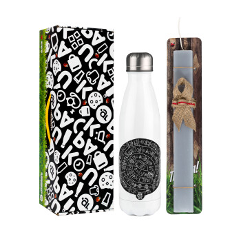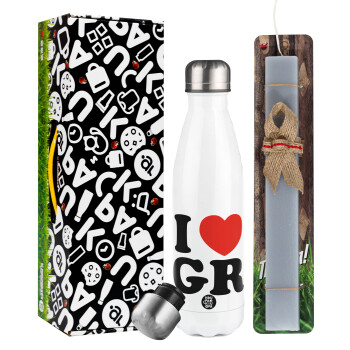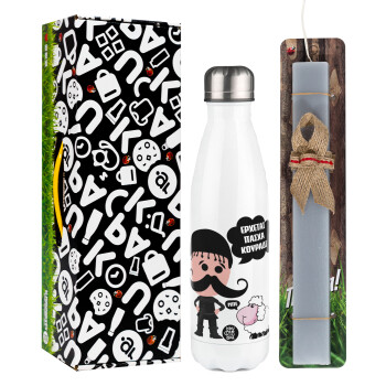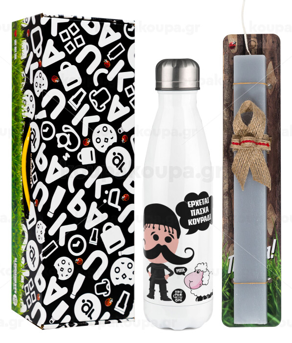 Κρητικός "Έρχεται Πάσχα κουράδι", Πασχαλινή Λαμπάδα με μεταλλικό παγούρι θερμός λευκός (500ml) & λαμπάδα αρωματική πλακέ (30cm) (ΓΚΡΙ)