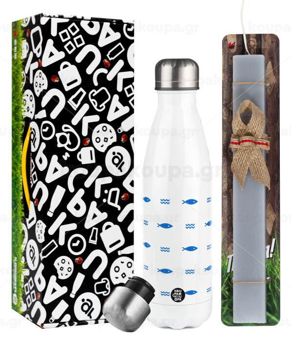Ψαράκια, Πασχαλινή Λαμπάδα με μεταλλικό παγούρι θερμός λευκός (500ml) & λαμπάδα αρωματική πλακέ (30cm) (ΓΚΡΙ)