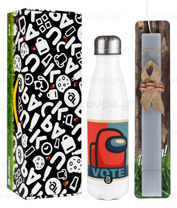 Among US VOTE, Πασχαλινή Λαμπάδα με μεταλλικό παγούρι θερμός λευκός (500ml) & λαμπάδα αρωματική πλακέ (30cm) (ΓΚΡΙ)