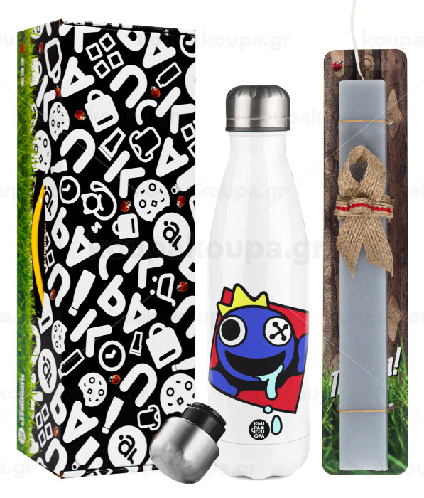 Blue, Rainbow friends, Πασχαλινή Λαμπάδα με μεταλλικό παγούρι θερμός λευκός (500ml) & λαμπάδα αρωματική πλακέ (30cm) (ΓΚΡΙ)