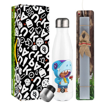 Brawl Stars Leon Shark, Πασχαλινή Λαμπάδα με μεταλλικό παγούρι θερμός λευκός (500ml) & λαμπάδα αρωματική πλακέ (30cm) (ΓΚΡΙ)