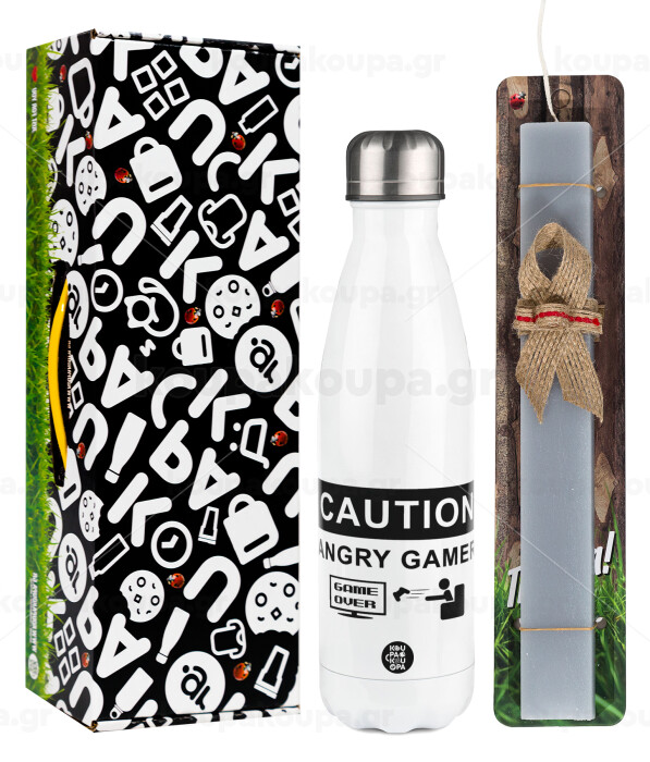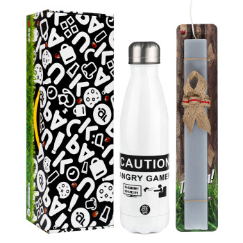 Caution, angry gamer!, Πασχαλινή Λαμπάδα με μεταλλικό παγούρι θερμός λευκός (500ml) & λαμπάδα αρωματική πλακέ (30cm) (ΓΚΡΙ)