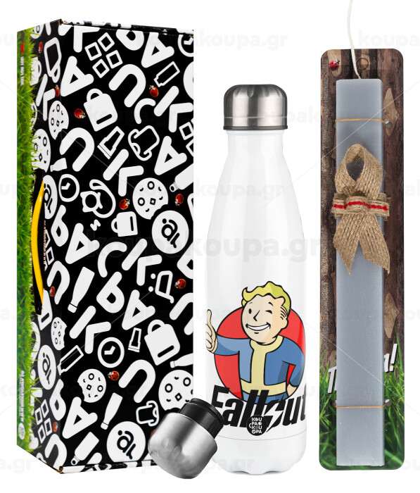 Fallout Vault Boy, Πασχαλινή Λαμπάδα με μεταλλικό παγούρι θερμός λευκός (500ml) & λαμπάδα αρωματική πλακέ (30cm) (ΓΚΡΙ)