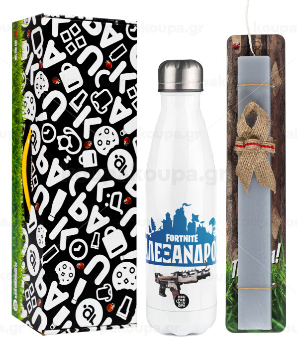 Fortnite with gun με το όνομα σου, Πασχαλινή Λαμπάδα με μεταλλικό παγούρι θερμός λευκός (500ml) & λαμπάδα αρωματική πλακέ (30cm) (ΓΚΡΙ)