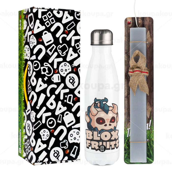 Roblox Blox Fruits, Πασχαλινή Λαμπάδα με μεταλλικό παγούρι θερμός λευκός (500ml) & λαμπάδα αρωματική πλακέ (30cm) (ΓΚΡΙ)