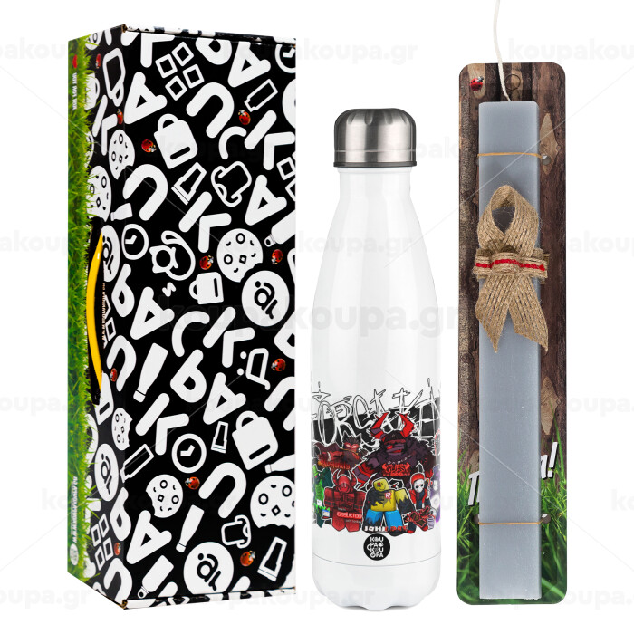 Roblox Forsaken, Πασχαλινή Λαμπάδα με μεταλλικό παγούρι θερμός λευκός (500ml) & λαμπάδα αρωματική πλακέ (30cm) (ΓΚΡΙ)