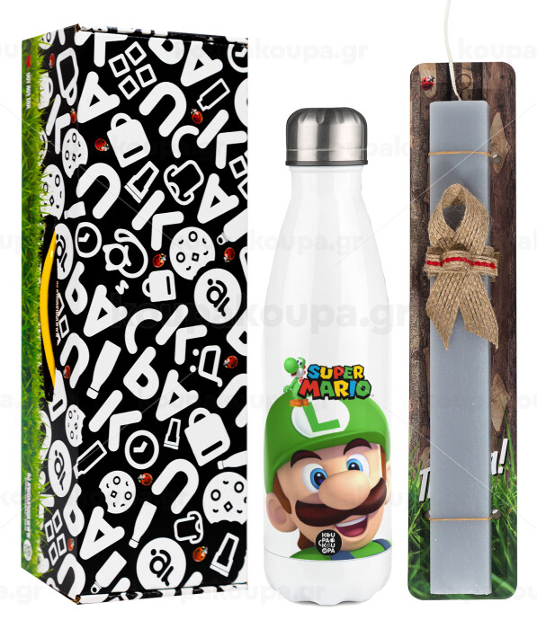 Super mario Luigi, Πασχαλινή Λαμπάδα με μεταλλικό παγούρι θερμός λευκός (500ml) & λαμπάδα αρωματική πλακέ (30cm) (ΓΚΡΙ)