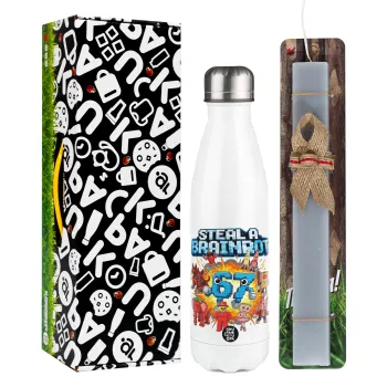 Steal a Brainrot 67 Roblox Style, Πασχαλινή Λαμπάδα με μεταλλικό παγούρι θερμός λευκός (500ml) & λαμπάδα αρωματική πλακέ (30cm) (ΓΚΡΙ)