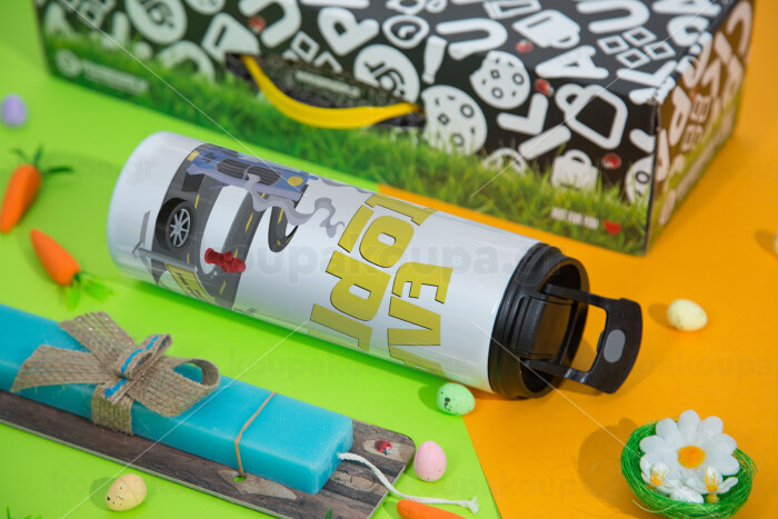 Έλα Γιώργη, πω πω μια στροφάρα, Πασχαλινή Λαμπάδα με Travel Tumbler θερμό με διπλό καπάκι (600ml, BPA free) & κερί αρωματικό πλακέ (30cm) (ΤΙΡΚΟΥΑΖ)