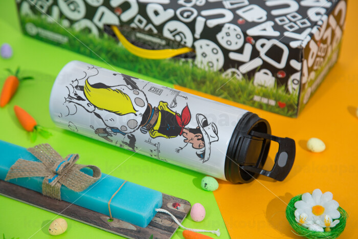 Λούκυ Λουκ comic, Πασχαλινή Λαμπάδα με Travel Tumbler θερμό με διπλό καπάκι (600ml, BPA free) & κερί αρωματικό πλακέ (30cm) (ΤΙΡΚΟΥΑΖ)